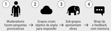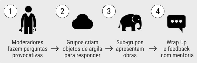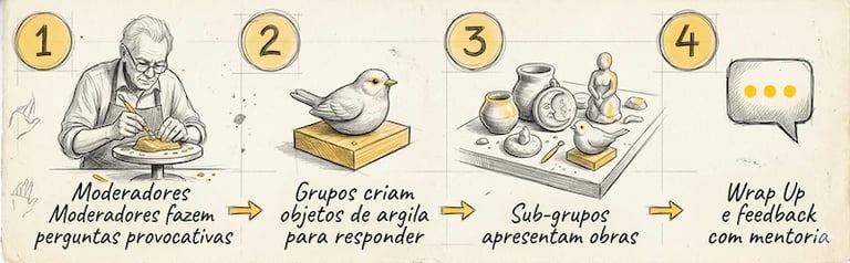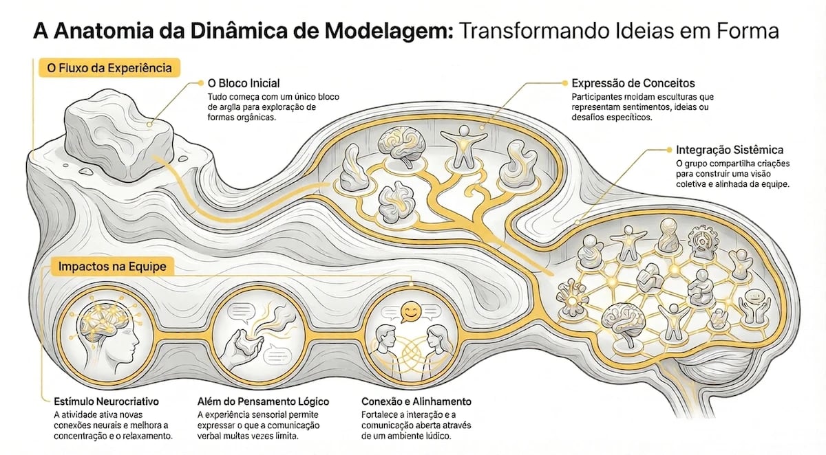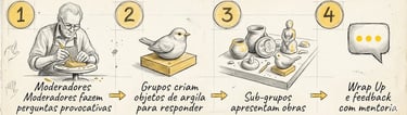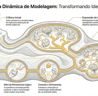 A modelagem é uma dinâmica colaborativa onde os participantes utilizam a argila para criar modelos que representem ideias, sentimentos ou conceitos relacionados a um tema específico.