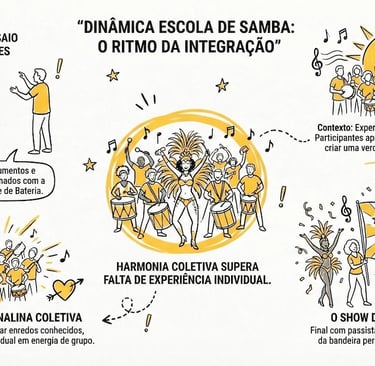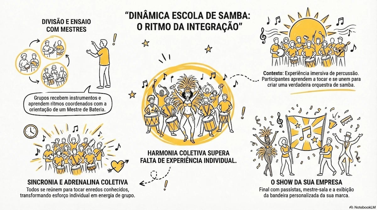 Inspirada nas escolas de samba, envolve todos os participantes no aprendizado e execução de batidas e ritmos coordenados, criando uma "orquestra" de percussão.
