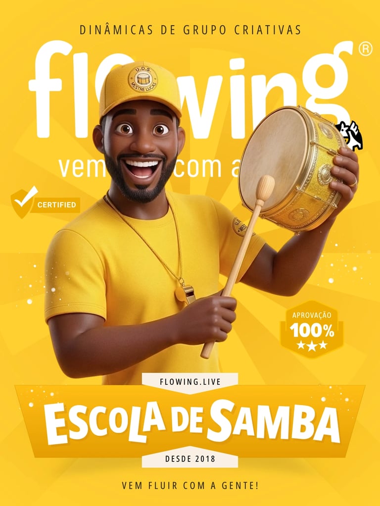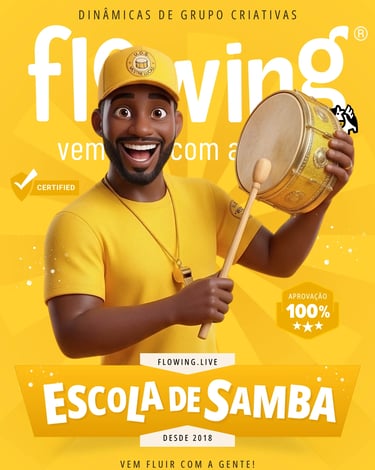 Surpreendentemente, a Bateria toca em harmonia e energia! No final, passistas, porta-bandeira e mestre sala podem apresentar uma bandeira da empresa (feita por nós).