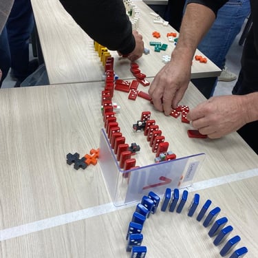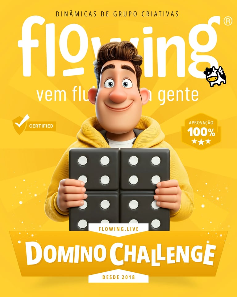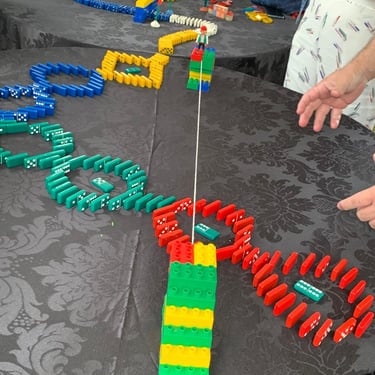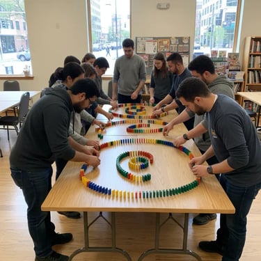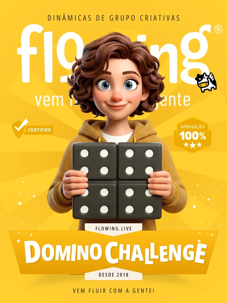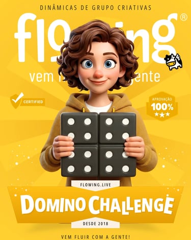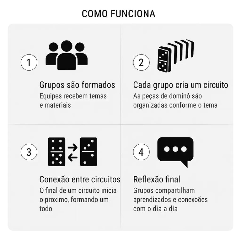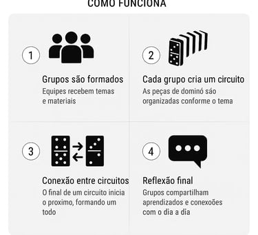 Uma atividade colaborativa em que grupos constroem, com peças de dominó, um circuito único e interligado. Cada equipe desenvolve um trecho temático que se conecta ao seguinte, exigindo coordenação, planejamento e cooperação.