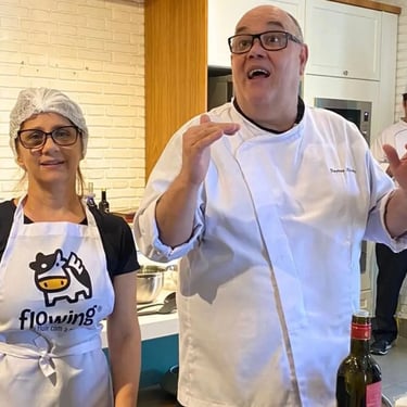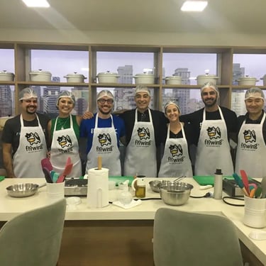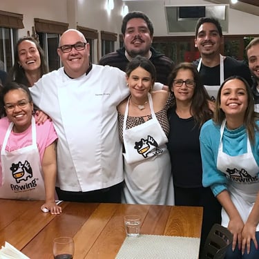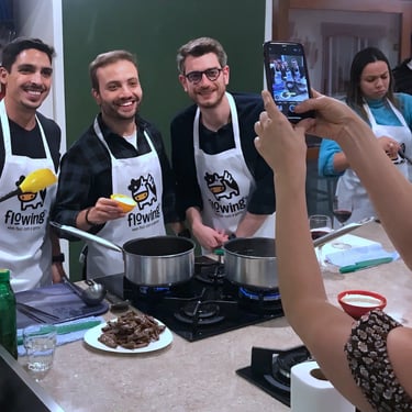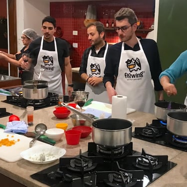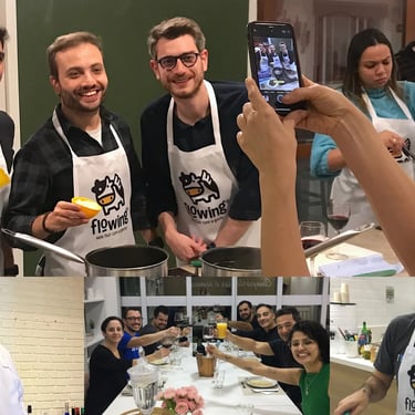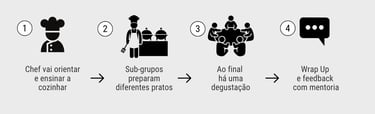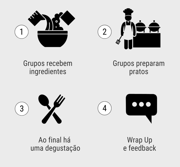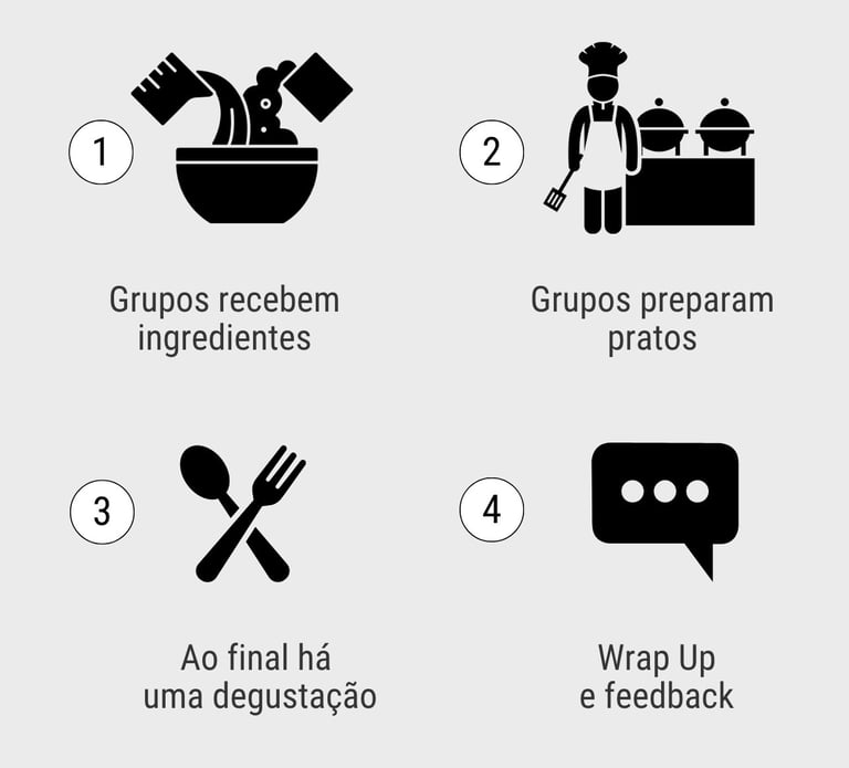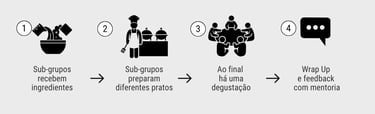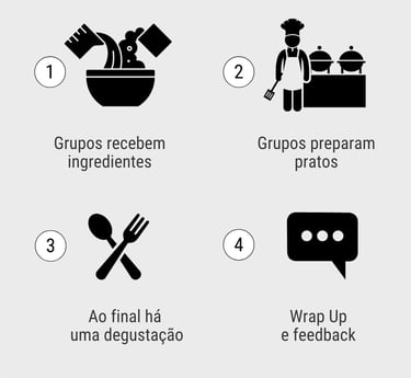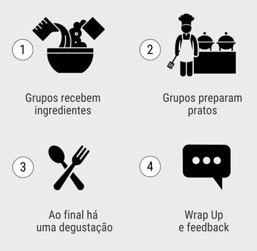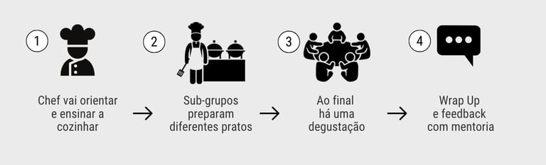 Une aprendizado e colaboração. Um chef orienta o grupo, que se divide para preparar diferentes pratos. Ao final, todos participam de uma degustação e de um breve momento de feedback com mentoria.