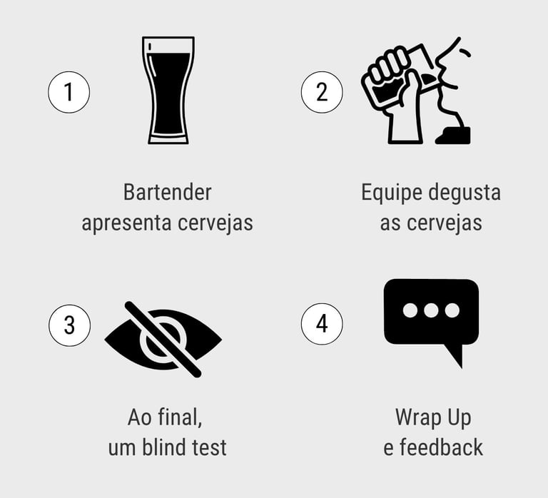 O bartender conduz uma imersão pelas principais escolas cervejeiras, contando histórias, origens e curiosidades enquanto o grupo degusta cada estilo. A experiência termina com um breve blind test competitivo e um encerramento com feedback e mentoria.